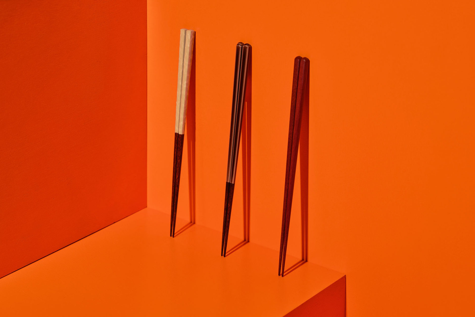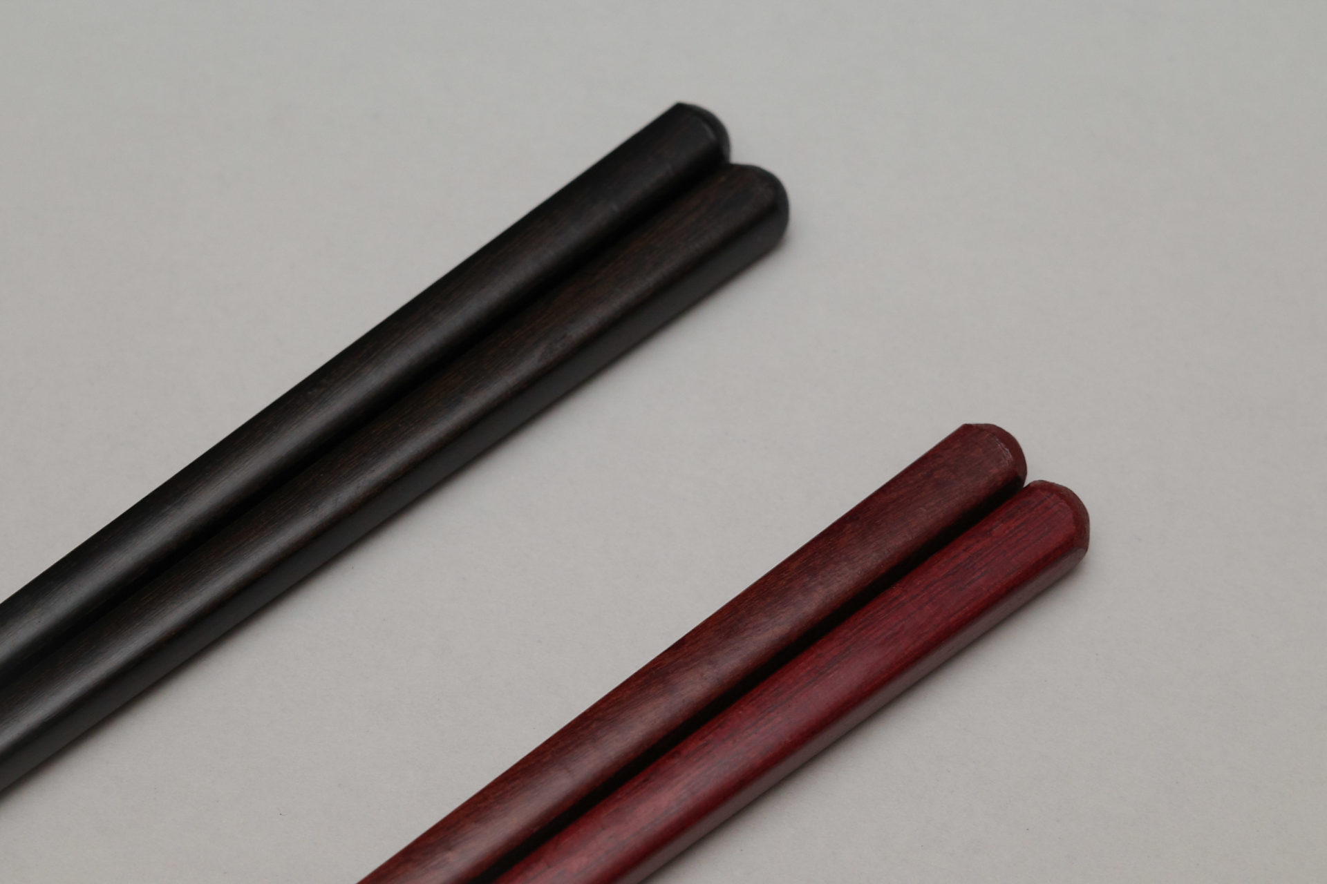 そこで、あえてシンプルな方向に振りました。漆塗りのお箸に比べると、合成塗料のお箸はペタっとしていて、
